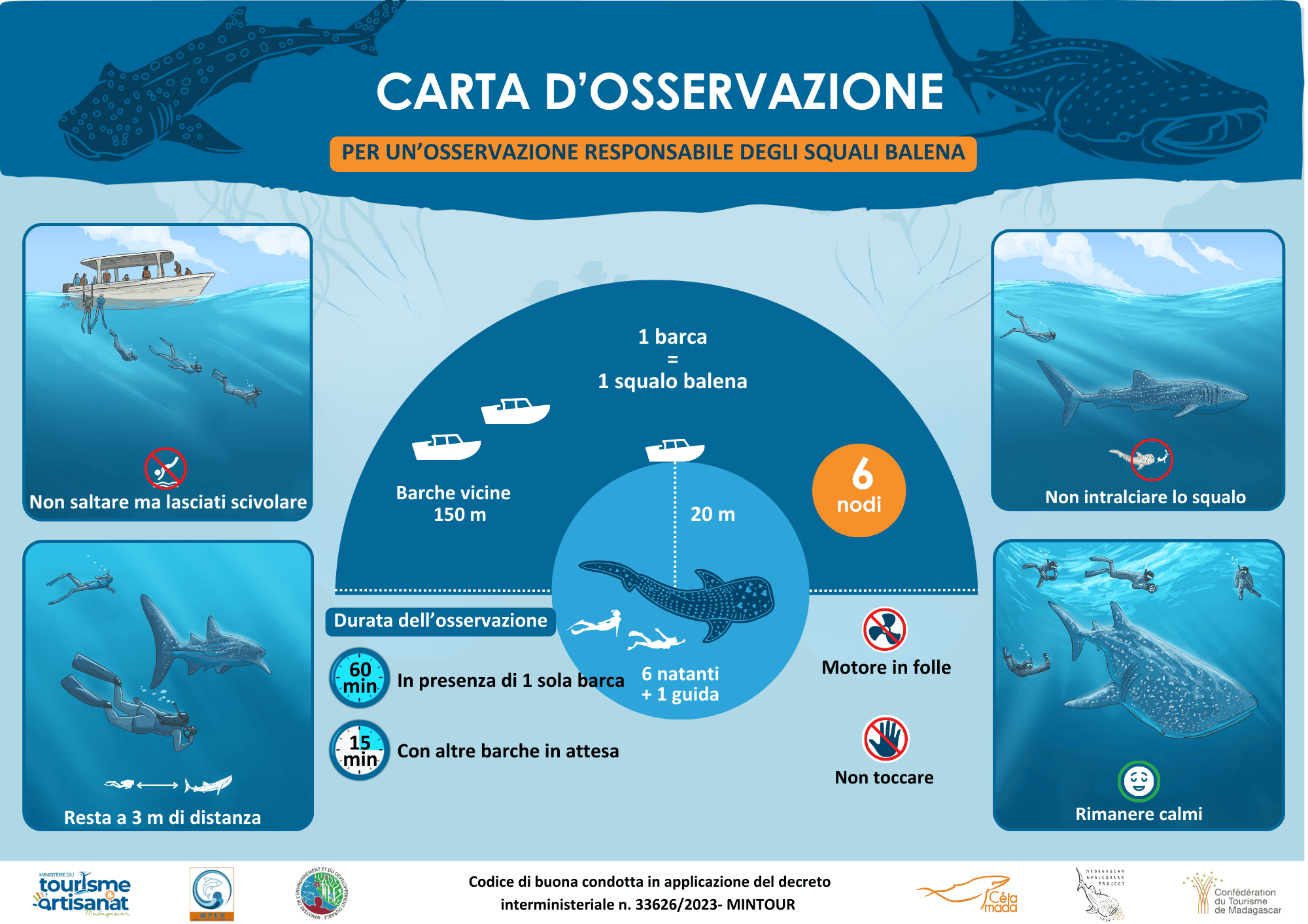 Since 2017, we have trained more than 300 people working in the tourism industry, including skippers and guides. As a client, please choose a responsible operator and ask your guide and skipper to follow the code of conduct. As a swimmer, do follow the rules to not disturb the shark while in the water with them.
